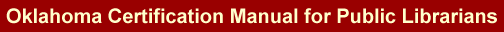 4th Revised Edition Approved by the Oklahoma Library Association Approved by the Oklahoma Department of Libraries Questions or Comments: Cathy Van Hoy, Certification Specialist Sadie Bruce, Adapted from the Indiana Library Certification Board's Official Rules and Regulations; from the Public Library Personnel Certification for Michigan Program, and from the Iowa Certification Manual for Public Librarians. |